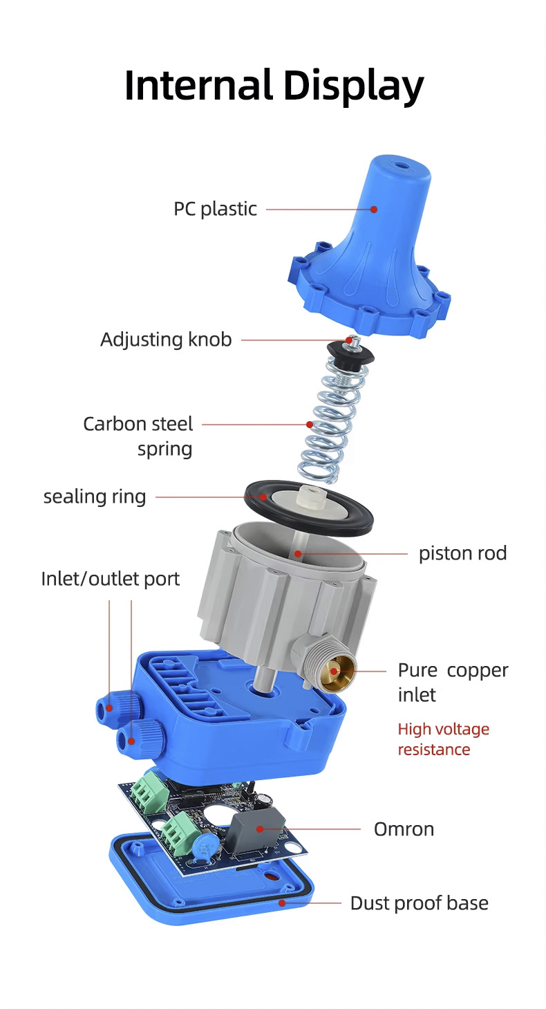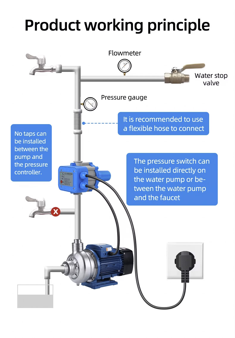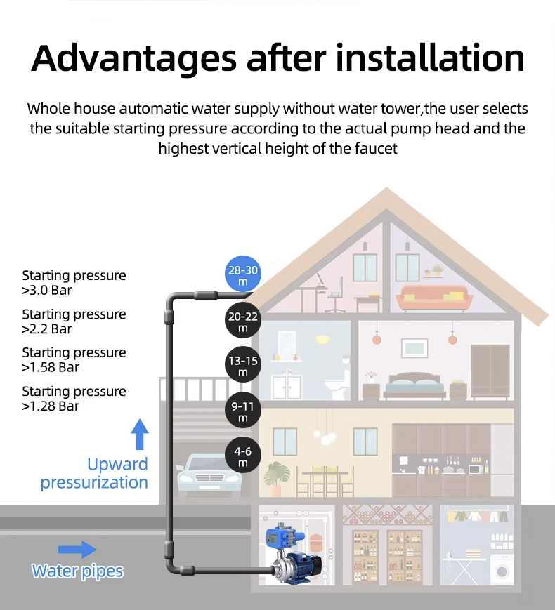 Pengawal pam automatik Pengawal tekanan elektronik pam air boleh menggantikan pemasangan pam air automatik yang rumit. Ia mempunyai ciri prestasi yang stabil, penyelenggaraan yang rendah dan jangka hayat yang panjang.