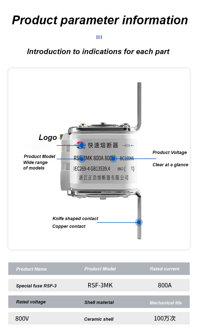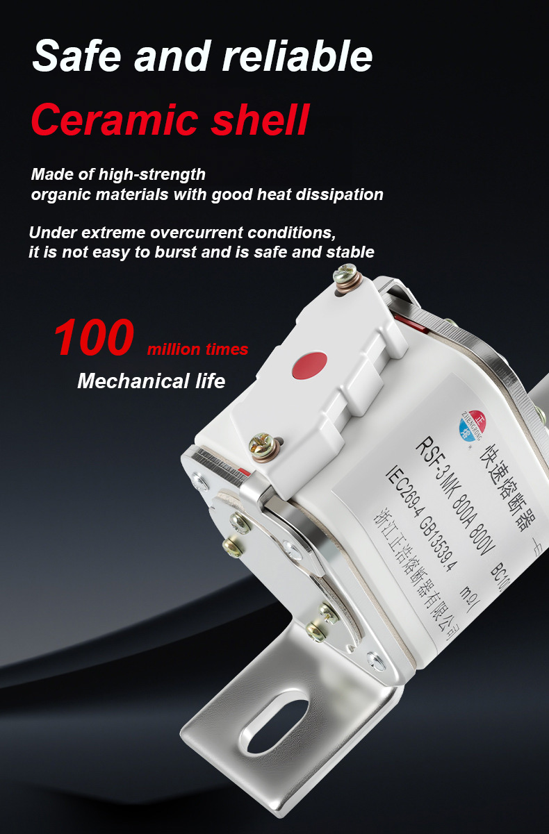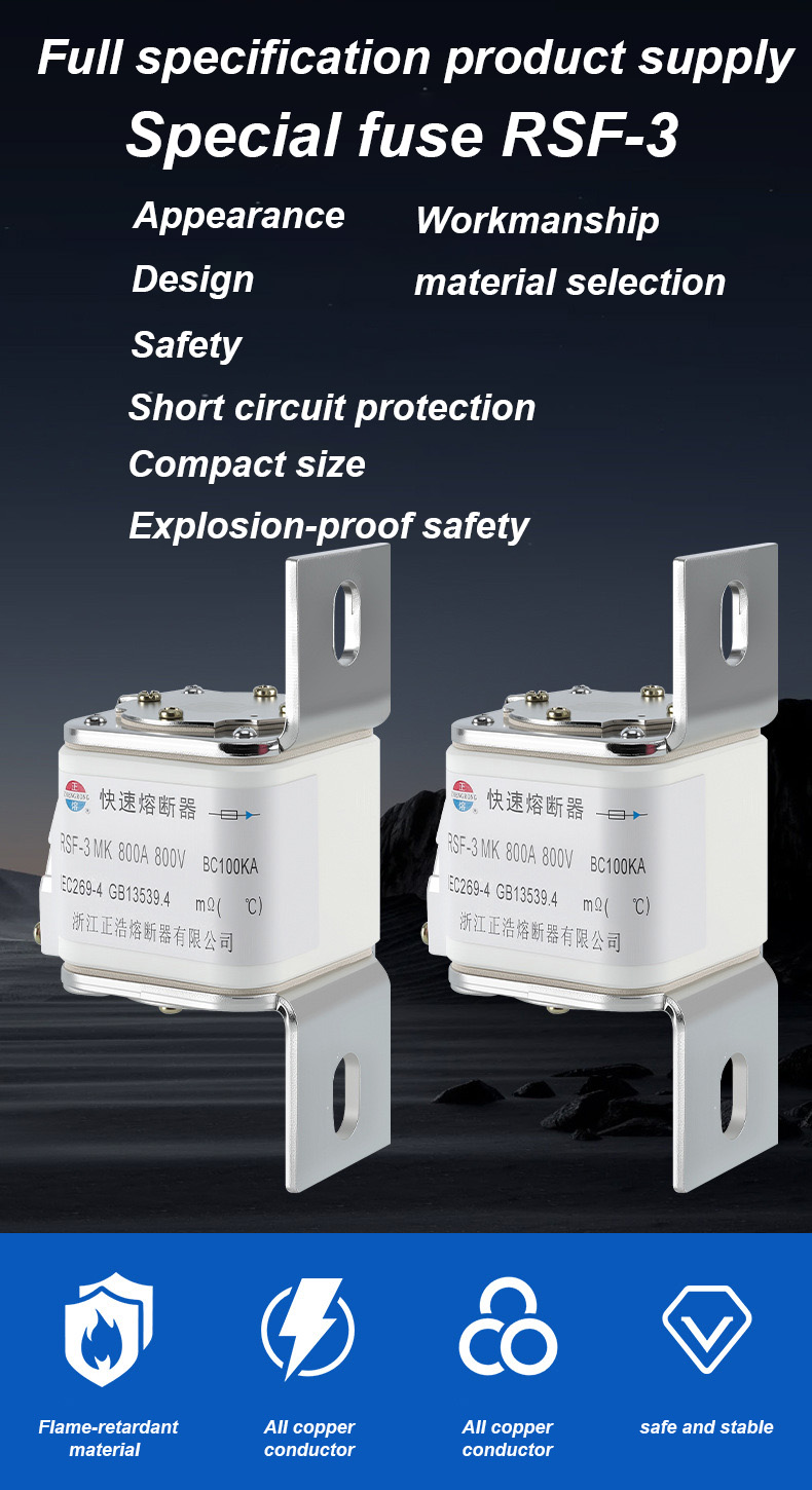 mempunyai voltan berkadar 500V dan arus berkadar 315A, yang boleh memastikan keselamatan elektrik dengan berkesan, mencegah beban lampau dan litar pintas. Pautan fius RSF-3MK 800V-800A BC100KA